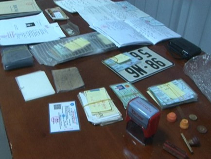 Khám xét nhà Lập ngay sau đó, lực lượng Công an thu được 8 xe mô tô, 1 máy ép plastic, 1 máy ép cạnh, 19 giấy phép lái xe, 14 BKS xe máy, 4 dấu chức danh, 2 khẩu súng và nhiều giấy khám sức khỏe, học bạ…