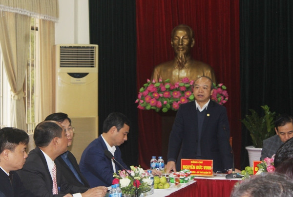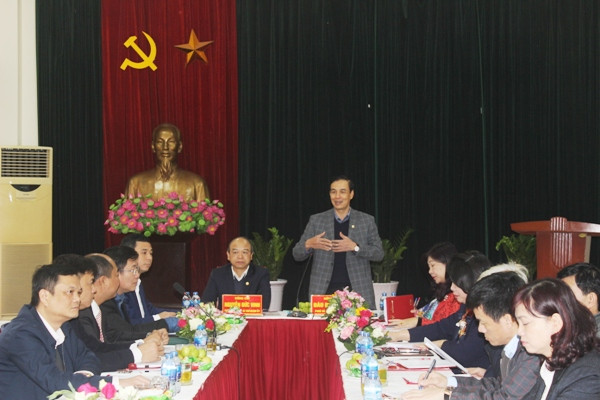 Bí thư Quận ủy Hoàng Mai Nguyễn Đức Vinh phát biểu tại buổi làm việc của đoàn công tác Thành ủy tại phường Định Công