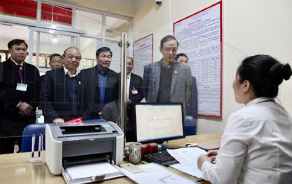 Phó Bí thư Thành ủy Hà Nội Đào Đức Toàn kiểm tra tại bộ phận một cửa của UBND phường Định Công