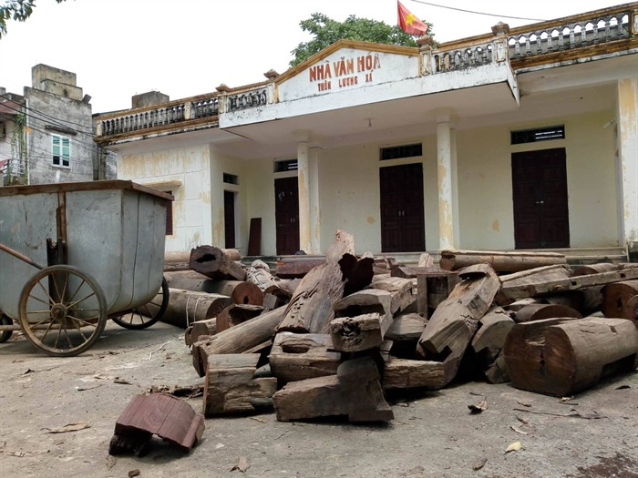 Các cấu kiện gỗ đang được "bảo quản" tại Nhà văn hóa xã (ảnh Quang Tấn)