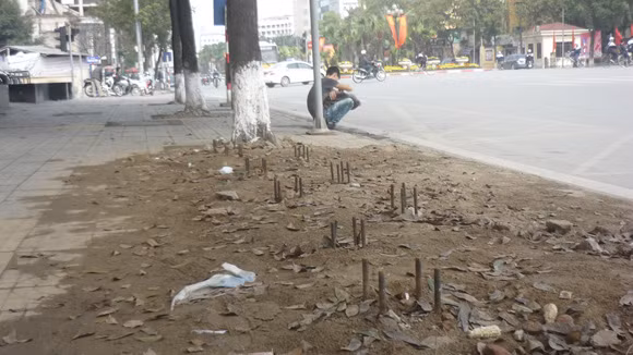 Đó là những gì còn lại sau khi nhà chờ xe buýt ở đây bị dỡ bỏ khiến hàng chục chiếc cọc sắt nhô lên khỏi mặt đất khoảng 15cm nằm ngay trên vỉa hè đông người qua lại. Chỉ một chút sơ suất, người dân sẽ bị tai nạn khi vấp phải “bãi chông” này. Đề nghị cơ quan chức năng có biện pháp dỡ bỏ những cọc sắt nguy hiểm này để người dân đi trên vỉa hè được an toàn.