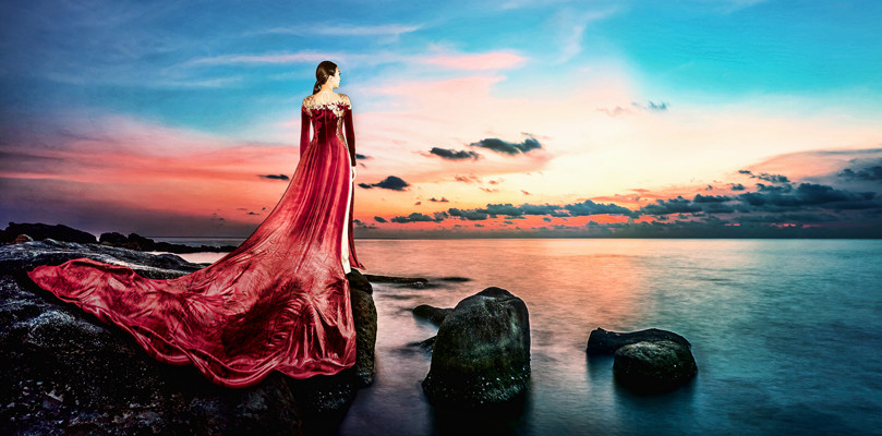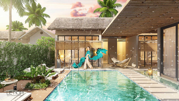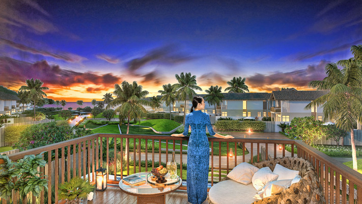 Hội tụ tất cả vẻ đẹp của mây trời, biển cả nơi đảo Ngọc, áo dài của Đỗ Trịnh Hoài Nam hòa quyện trong bối cảnh sang trọng, xa hoa nhưng vẫn đậm nét truyền thống bản địa của những biệt thự “ngôi làng biển”. Bức ảnh phối cảnh 3D đã tôn vinh rõ nét đẹp này.