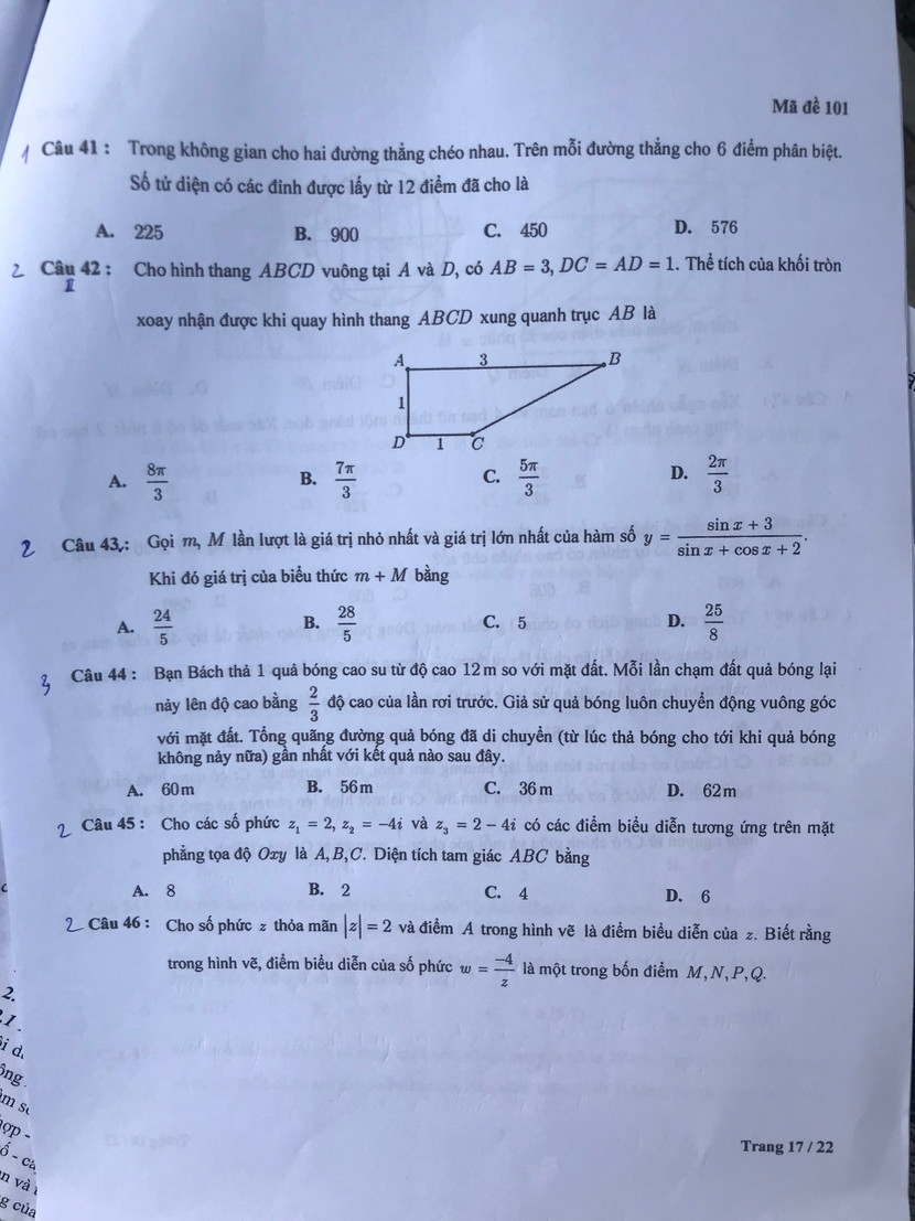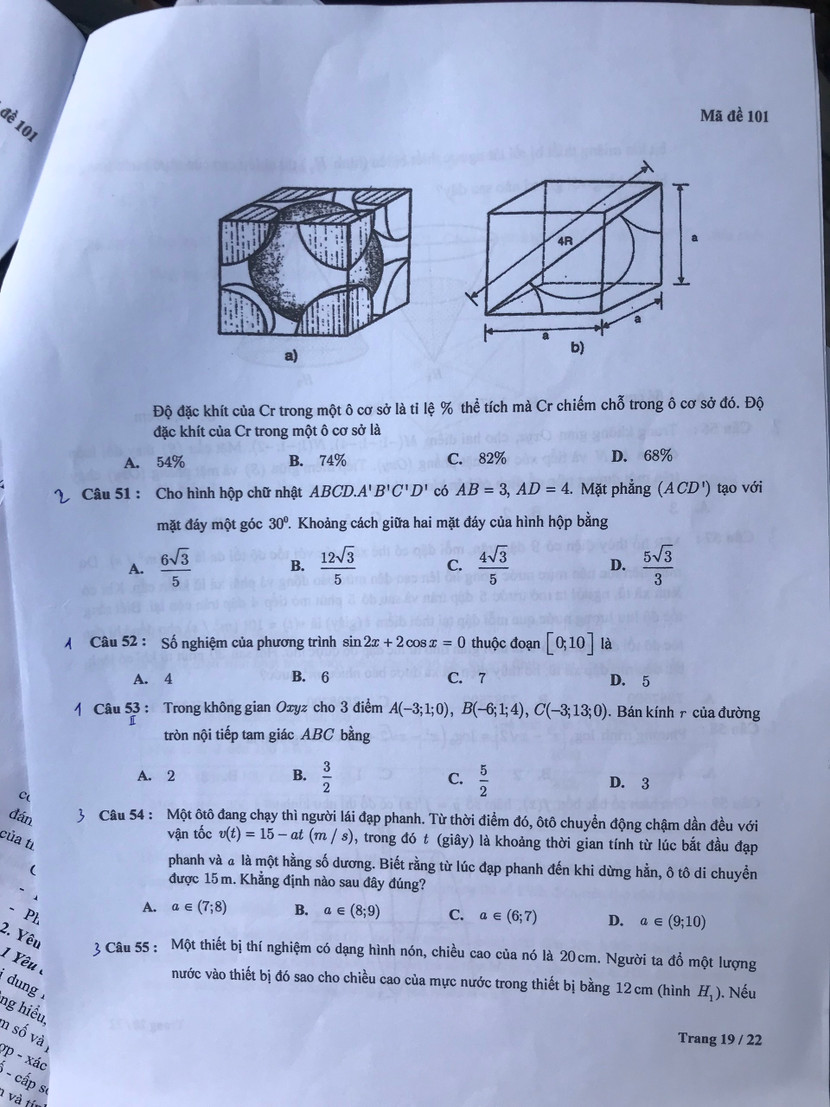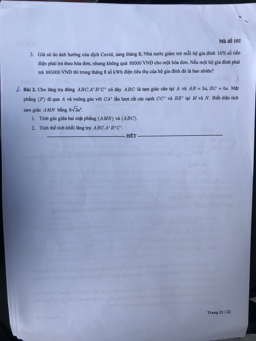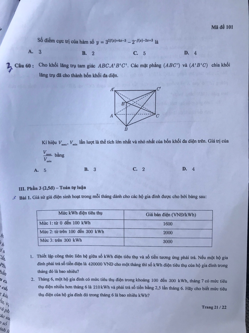 Câu 2: Là câu hỏi về hình học không gian cổ điển: tính góc giữa 2 mặt phẳng và thể tích của khối lăng trụ. Nội dung câu hỏi tương tự như câu hình không gian trong đề thi ĐH trước năm 2017.