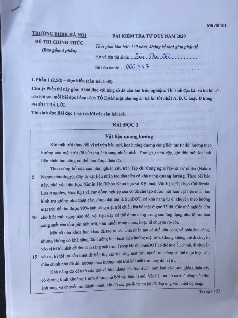 ANTD.VN - Bài kiểm tra tư duy của trường Đại học Bách Khoa Hà Nội năm 2020 diễn ra trong thời gian 120