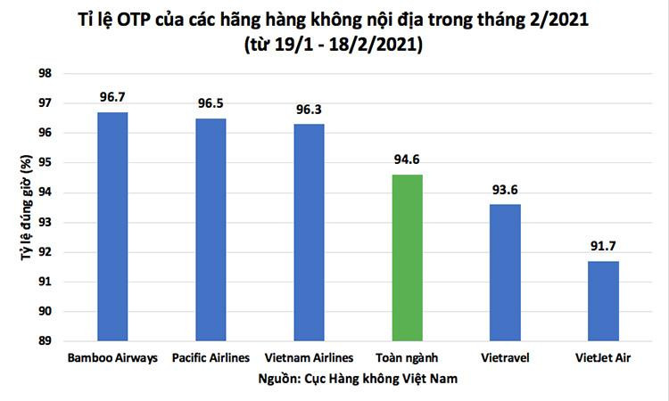 Cụ thể, theo số liệu của Cục Hàng không Việt Nam vừa công bố, trong giai đoạn từ 19/01/2021 - 18/02/2021, Bamboo Airways dẫn đầu toàn ngành về tỷ lệ bay đúng giờ, đạt 96,7%. Đứng ở các vị trí thứ hai và thứ 3 là Pacific Airlines đạt 96,5% và Vietnam Airlines đạt 96,3% chuyến bay đúng giờ. Vietravel Airlines, VASCO và Vietjet Air chia nhau các vị trí còn lại, lần lượt có OTP ở mức 93,6%, 93,4% và 91,7%. Tỉ lệ đúng giờ trung bình toàn ngành đạt 94,6%.