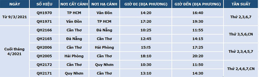 Từ tháng 3/2021, Bamboo Airways chính thức khai thác trở lại đường bay TP HCM – Vân Đồn với tần suất 4 chuyến khứ hồi/tuần, tần suất chung sẽ tăng dần tùy thuộc vào nhu cầu thực tế của hành khách. Trước đó, hãng đã tạm dừng các đường bay đi/đến Vân Đồn khi sân bay này tạm thời đóng cửa để đảm bảo công tác phòng chống dịch Covid-19.