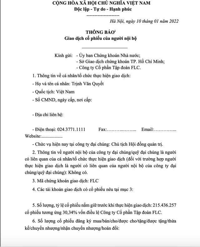 Theo đó, Báo cáo số 31/SGDHCM-GS đề ngày 10/01/2022 của Sở Giao dịch chứng khoán TP.HCM cho biết, ông Trịnh Văn Quyết, Chủ tịch Hội đồng Quản trị Công ty cổ phần Tập đoàn FLC giao dịch bán 74,8 triệu cổ phiếu Công ty cổ phần Tập đoàn FLC nhưng không báo cáo, không công bố thông tin trước khi thực hiện giao dịch theo khoản 1 Điều 33 Thông tư số 96/2020/TT-BTC ngày 16/11/2020 của Bộ trưởng Bộ Tài chính hướng dẫn công bố thông tin trên thị trường chứng khoán.