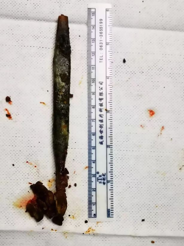 Các bác sỹ đã sử dụng máy nội soi để gắp bàn chải ra. Chiếc bàn chải đánh răng gần như không thể nhận ra, nó đen hoàn toàn và lông bàn chải không còn.