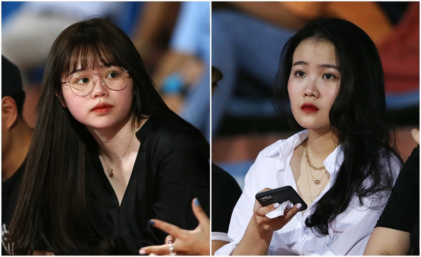 Huỳnh Anh - bạn gái Quang Hải (trái) và Hoàng Anh - bạn gái Văn Hậu trên sân Hàng Đẫy tối 18-6 (Ảnh: Vũ Vy)