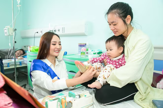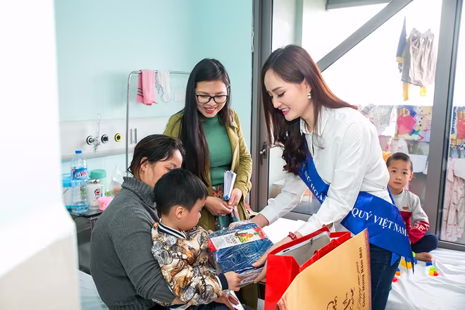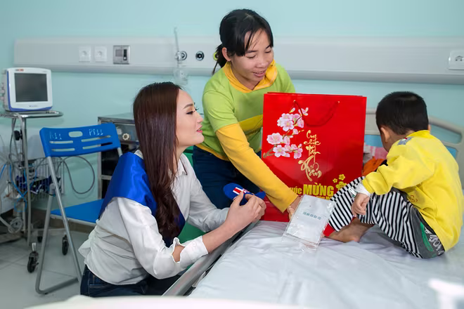 Bên cạnh việc trao quà tặng và tiền mặt cho đại diện gia đình các bệnh nhi đang điều trị tại đây, Nữ hoàng Nguyễn Thị Oanh không còn dành nhiều thời gian nán lại trò chuyện, thăm hỏi, động viên các em nhỏ lạc quan để sớm vượt qua bệnh tật. Người đẹp cũng vô cùng xúc động khi được biết về bệnh tình và hoàn cảnh của các em.