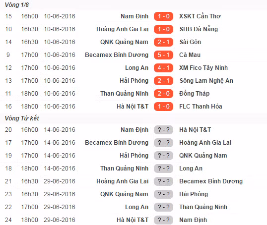 Kết quả vòng 1/8, lịch thi đấu tứ kết Cúp Quốc gia 2016