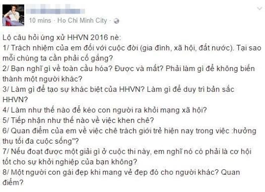 Ít giờ trước khi diễn ra đêm chung kết “Hoa hậu Việt Nam 2016”, chủ nhân của một tài khoản trên trang mạng xã hội Facebook bất ngờ đăng tải danh sách 8 câu hỏi được người này cho là “lộ câu hỏi ứng xử”. Các câu hỏi này có nội dung trùng khớp với câu hỏi mà Top 5 thí sinh nhận được tại phần thi ứng xử diễn ra trong đêm chung kết sau đó.