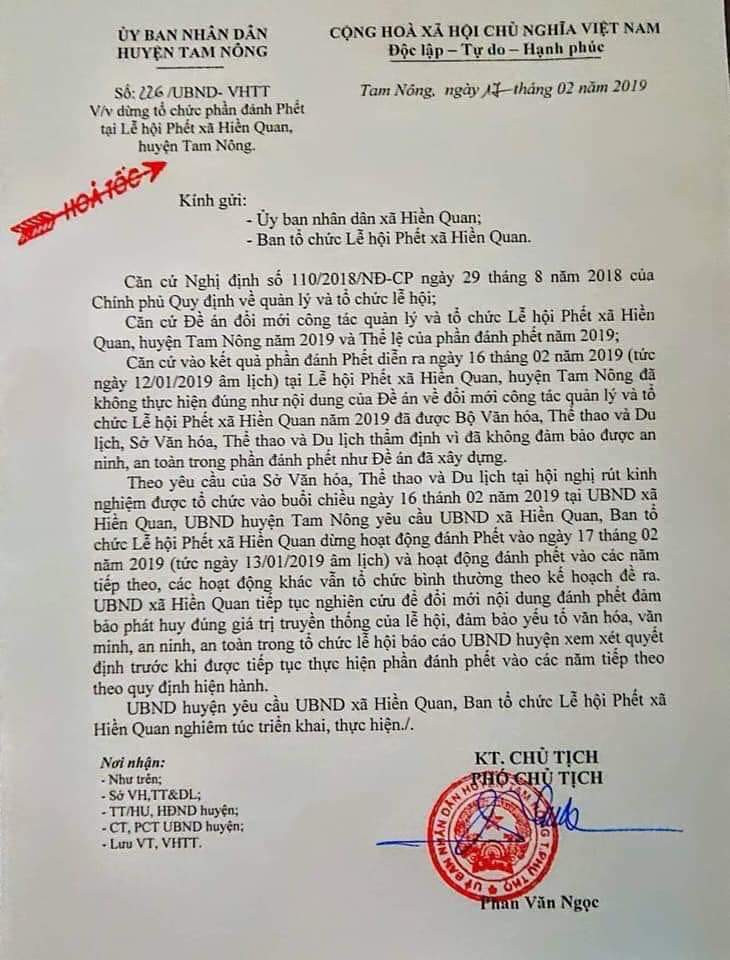 Ông Nguyễn Đắc Thủy chia sẻ, màn cướp phết là nghi lễ cuối cùng của Hội Phết Hiền Quan. Nhưng ngày hôm qua (16-2) đã xảy ra những tình huống tranh cướp vượt ra ngoài thể lể và cam kết của BTC như du khách xé rào cùng tham gia tranh phết hay những hình ảnh bạo lực, phản cảm... Trước tình trạng này, Sở VH-TT&DL tỉnh Phú Thọ đã ra quyết định dừng cướp phết để đảm bảo thực hiện đúng tinh thần chỉ đạo của Bộ VH-TT&DL và tạo nên một lễ hội văn minh, an toàn cho tính mạng, tài sản của người dân.