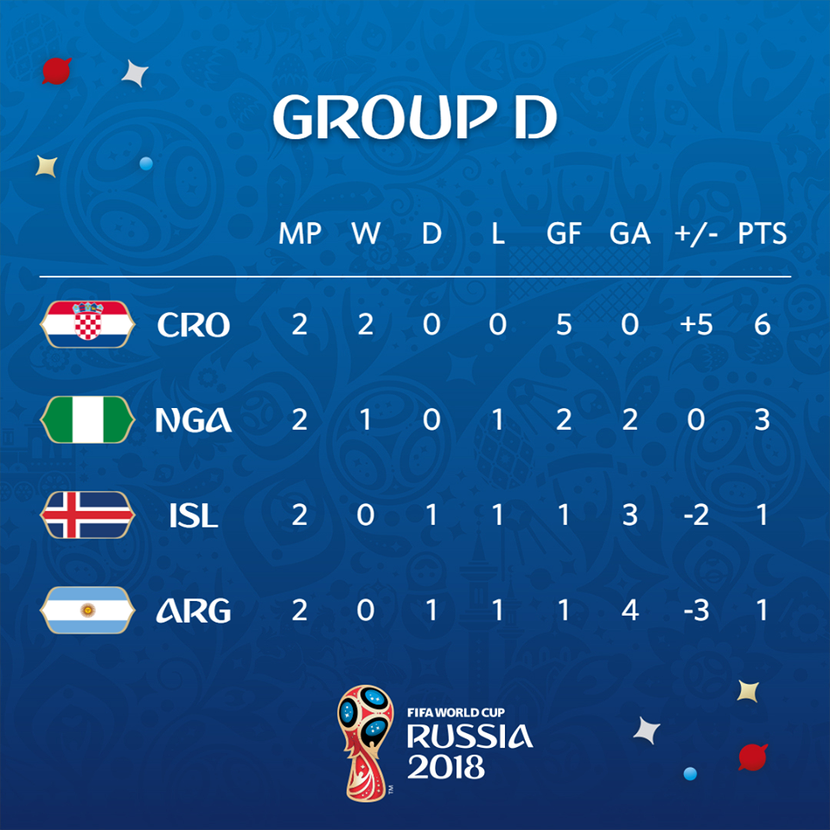 Ở bảng D hiện tại, Croatia đã chính thức góp mặt ở vòng sau. Tấm vé còn lại sẽ là sự cạnh tranh căng thẳng của Argentina, Iceland và Nigeria.