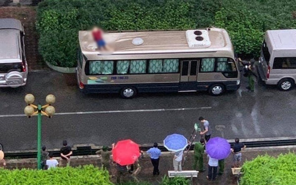 Trước đó, khoảng 7h ngày 12-5, người dân phát hiện thấy thi thể nạn nhân mặc áo phông đỏ, quần ngắn màu xanh nằm trên nóc xe ô tô 29 chỗ đỗ dưới tòa nhà đã báo cơ quan Công an.