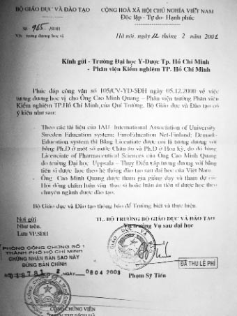 Ngày 12-2-2001, phúc đáp Công văn số 105/CV-YD-SĐH ngày 5-12-2000 về việc tương đương học vị cho ông Cao Minh Quang - Phân viện trưởng Phân viện Kiểm nghiệm TP.HCM, của trường Đại học Đại học Y-Dược TP.HCM, Thừa lệnh Bộ trưởng Bộ Giáo dục và Đào tạo, ông Phạm Sỹ Tiến - Vụ trưởng Vụ Sau Đại học có ý kiến như sau: