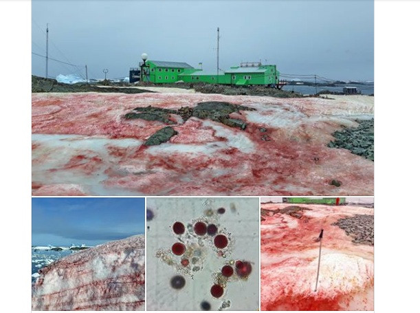 Băng tuyết ở đây đã đổi màu vì loại rong biển nhỏ có lớp carotene đỏ được gọi là Chlamydomonas Nivalis. Loại rong này nằm sâu dưới tuyết vào mùa đông, nhưng bay lên bề mặt để sinh sản khi trời trở nên ấm hơn. Và hiện giờ đang là mùa hè ở Nam Cực.