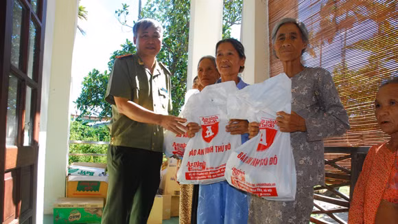 Đồng chí Vũ Kim Thành, Phó Tổng biên tập Báo ANTĐ trao quà cho người dân Quảng Nam