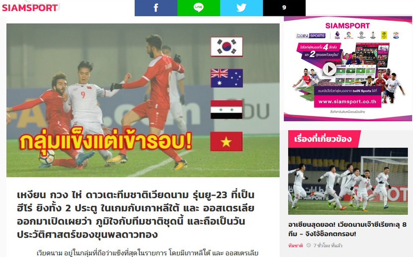 Tờ Siam Sport (Thái Lan) phiên bản online đăng bài viết "U23 Việt Nam vào tứ kết - niềm tự hào của ASEAN" trên trang nhất, chỉ vài phút sau khi U23 Việt Nam cầm hòa đối thủ Syria.