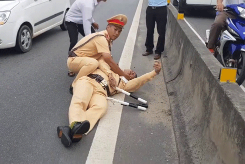 Sau khi nhận được thông báo lỗi vi phạm vượt quá tốc độ, lái xe không những không xuất trình giấy tờ mà còn lên xe đóng cửa lại và bất ngờ cho xe chạy. Thượng úy Lê Hồ Việt Anh đang đứng trước bên phải đầu xe nhanh chóng nhảy được ra khỏi vùng nguy hiểm còn Thượng úy Nguyễn Anh Đức đứng phía bên trái đầu xe không tránh kịp buộc phải bám vào càng gương chiếu hậu phía trước mũi xe.