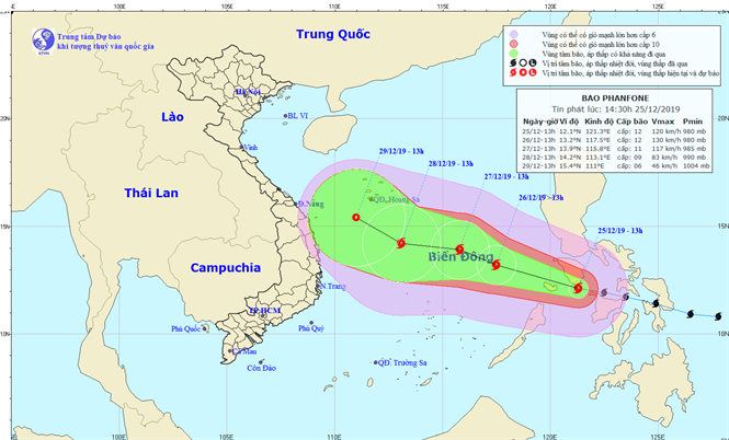 Trung tâm Dự báo khí tượng thủy văn quốc gia thông tin, vào đầu giờ chiều nay, 25/12, bão Phanfone đang ở khu vực miền Trung Philippines. Sức gió mạnh nhất vùng gần tâm bão mạnh cấp 12 (115-135km/giờ), giật cấp 14.