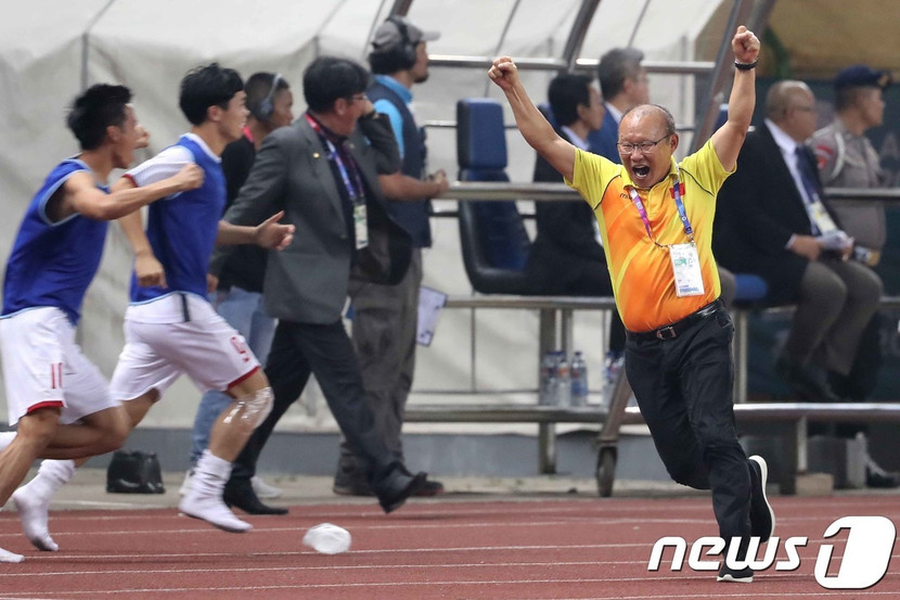 Báo Hàn Quốc đăng tải hình ảnh ăn mừng phấn khích của HLV Park Hang-seo, kèm theo đó là niềm tự hào khi một HLV Hàn Quốc giúp bóng đá Việt Nam lập kỳ tích giải châu Á