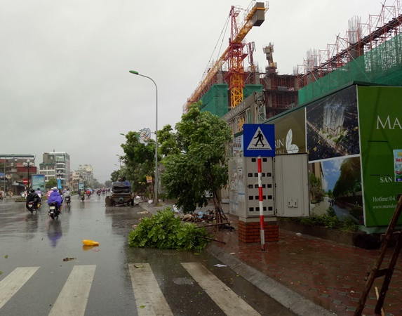 Cơn lốc ập đến bất ngờ khiến nhiều cây đổ một lúc trong khi một số người tham gia giao thông đang đi đến đoạn đường này (ảnh chụp lúc 7h00 sáng nay tại tuyến đường Tân Mai)