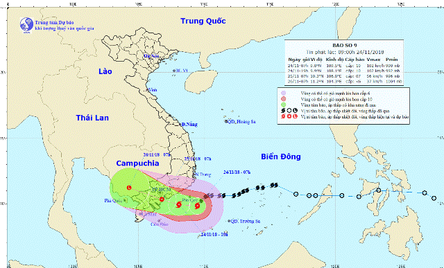 Dự báo trong 12 giờ tới, bão di chuyển theo hướng Tây mỗi giờ đi được khoảng 10-15km. Đến 19h ngày 24-11, vị trí tâm bão ngay trên vùng biển các tỉnh từ Bình Thuận đến Bến Tre. Sức gió mạnh nhất vùng gần tâm bão mạnh cấp 9-10 (75-100km/h), giật cấp 12. Bán kính gió mạnh cấp 6, giật cấp 8 khoảng 150km tính từ tâm bão; bán kính gió mạnh cấp 10, giật cấp 12 khoảng 50km.