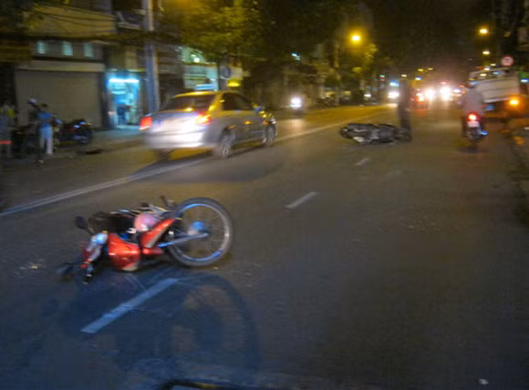 Bất ngờ, chiếc xe mất lái, lao thẳng ra ngoài đường CMT8, va chạm với hai xe máy. Cú va chạm khiến xe máy và hai phụ nữ điều khiển phương tiện trên bị trượt ngã xuống đường, gây thương tích.