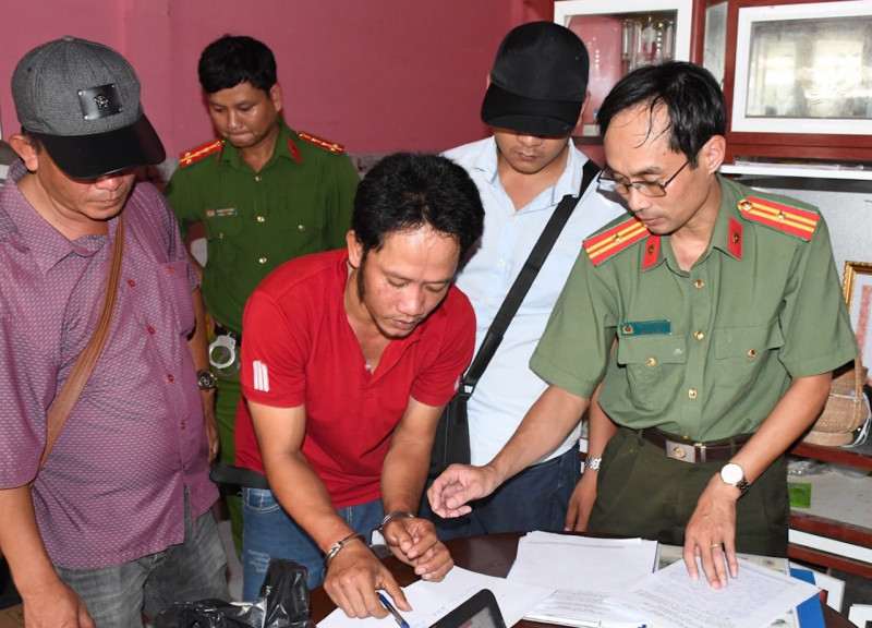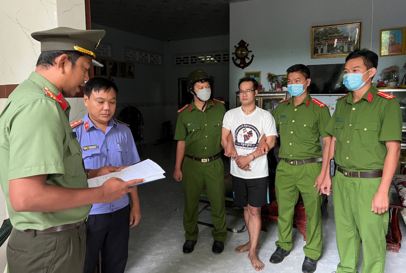 Cơ quan An ninh điều tra Công an tỉnh Trà Vinh thi hành lệnh bắt tạm giam bị can Tô Hoàng Chương. (Ảnh: Hồ Giang)