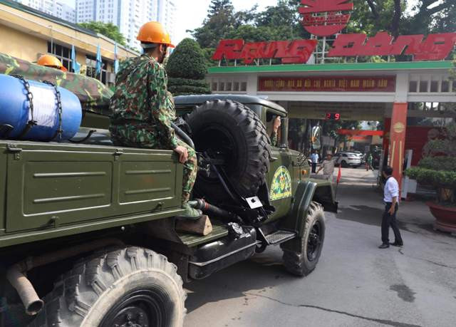 Từ 8h sáng nay, đoàn xe chuyên dụng của các đơn vị quân đội đã vào trong khuôn viên của Công ty Rạng Đông để bắt đầu công tác tiêu tẩy.
