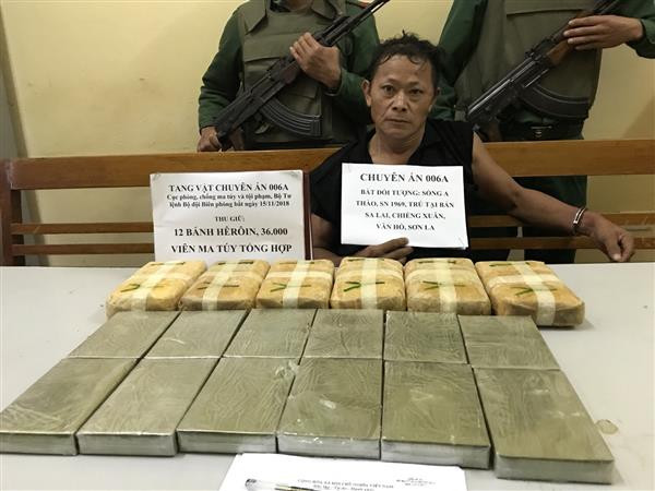 Trước đó, khoảng 15h30 ngày 15-11, tại khu vực biên giới xã Chiềng Sơn, huyện Mộc Châu, tỉnh Sơn La, Đoàn đặc nhiệm Miền Bắc - Cục Phòng chống ma túy và tội phạm (Bộ tư lệnh Biên Phòng) phối hợp với Bộ đội Biên phòng Sơn La, Công an tỉnh Sơn La, Công an huyện Mộc Châu, Đồn Biên phòng Cửa khẩu Lóng Sập phá thành công chuyên án, bắt giữ đối tượng mua bán trái phép 12 bánh heroin và 36.000 viên ma túy tổng hợp.