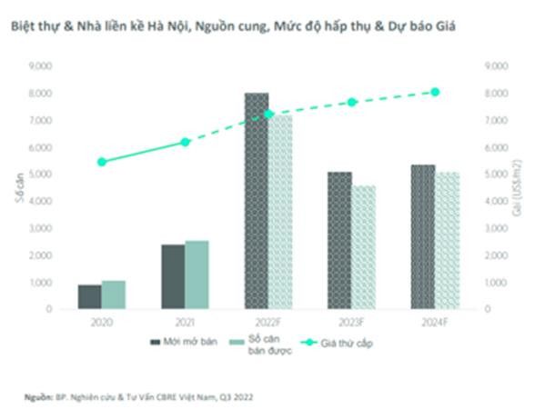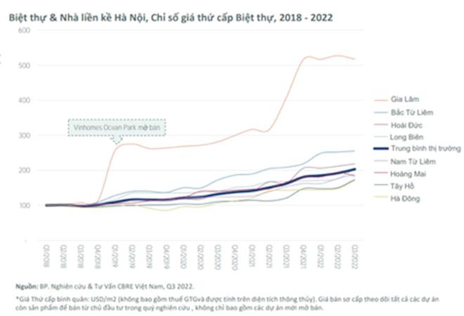 Theo báo cáo mới nhất của CBRE, thời gian gần đây, giá sơ cấp biệt thự và nhà liền kề Hà Nội đã tăng đáng kể. Riêng trong quý 3 năm 2022, mức giá bình quân toàn thị trường biệt thự, nhà liền kề Hà Nội đã tăng 36% so với cùng kỳ trong đó, giá sản phẩm biệt thự tăng 42%, giá nhà phố thương mại tăng 50%.