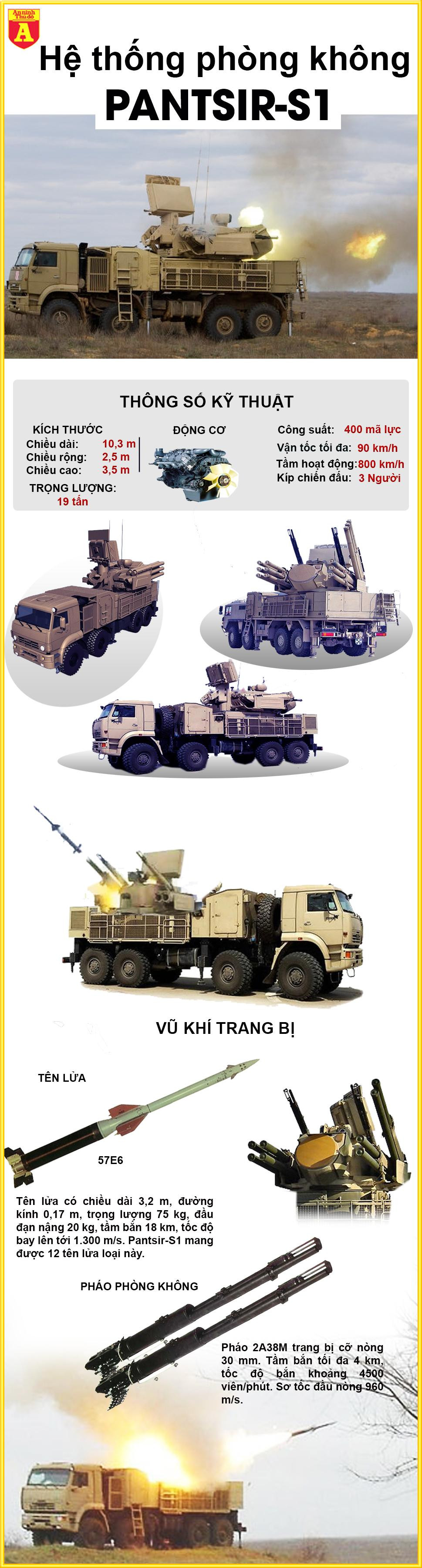 Pantsir-S1 (tên ký hiệu NATO SA-22 Greyhound) là một tổ hợp tên lửa - pháo phòng không tầm thấp hiệu quả của Nga. Hệ thống này được thiết kế với 2 pháo cao tốc 2A38M 30mm và 12 tên lửa phòng không tầm thấp 57E6. Trong đó pháo 2A38M có tốc độ bắn tối đa 2.500 phát/phút, tầm bắn tối đa 4km, tầm cao tối đa 3km. Còn tên lửa đối không tầm ngắn 57E6 nặng 90kg, dài 3,2m, lắp đầu đạn nổ phân mảnh nặng 20kg. Tên lửa kết cấu với 2 tầng động cơ nhiên liệu rắn cho phép đạt tốc độ hành trình 1.300m/s, tầm bắn 18km và diệt mục tiêu độ cao 15km.