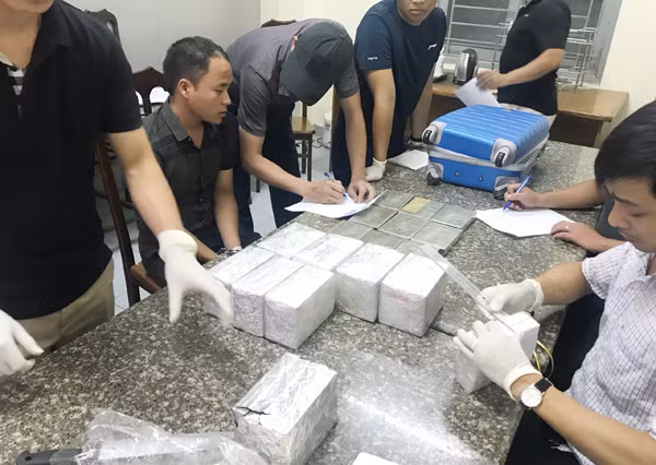Lực lượng CAQ Đống Đa kiểm tra chiếc va li kéo màu xanh đối tượng Chú xách theo và phát hiện bên trong có 40 bánh chất bột màu trắng hình hộp chữ nhật kích thước 15,5x10x2,5cm được bọc ngoài bằng nilon màu nâu. Qua giám định sơ bộ đều là heroine, có tổng trọng lượng hơn 14kg.