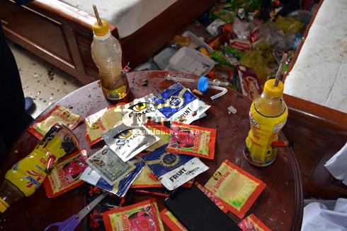 Đáng nói, toàn bộ bao bì đựng ma túy và dụng cụ sử dụng ma túy đá của nhóm đối tượng xả khắp căn phòng trong 5 ngày như bãi rác di động.