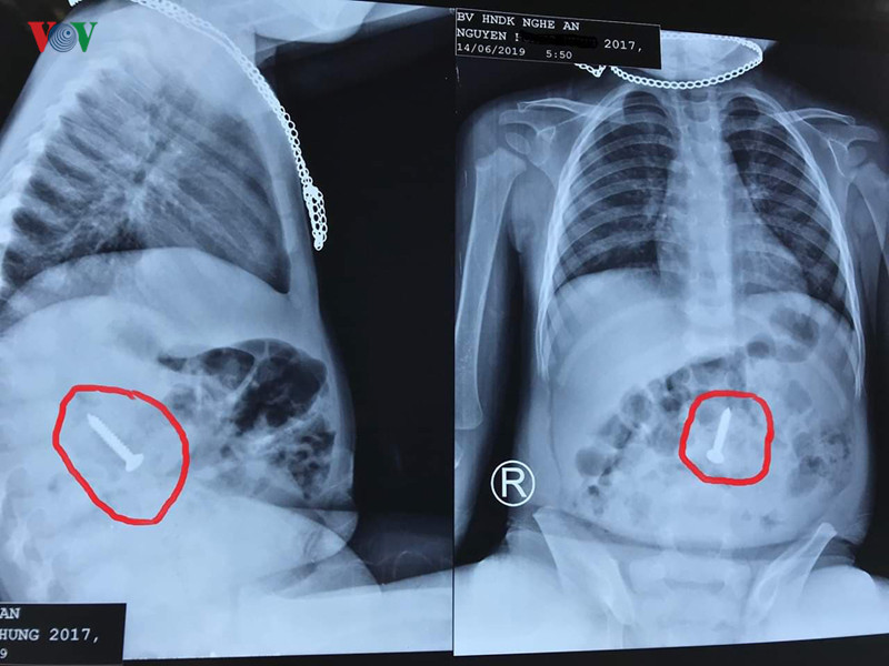 Trước đó, vào ngày 14-6, các bác sỹ tại bệnh viện Hữu nghị đa khoa Nghệ An cũng đã tiếp nhận bệnh nhi N.H.H (20 tháng tuổi). Bé H. được chẩn đoán là đã nuốt phải dị vật kim khí. Kết quả nội soi cho thấy tại đoạn cuối tá tràng của bệnh nhi có hình ảnh dị vật kim loại một đầu sắc nhọn (ốc vít kim loại) dài 3,5 cm.