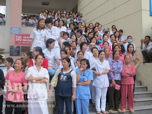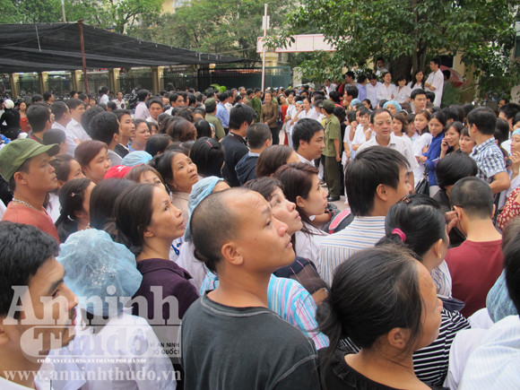 và người nhà sản phụ ùa ra sân chính bệnh viện chờ đợi giây phút cháu Trường trở về.