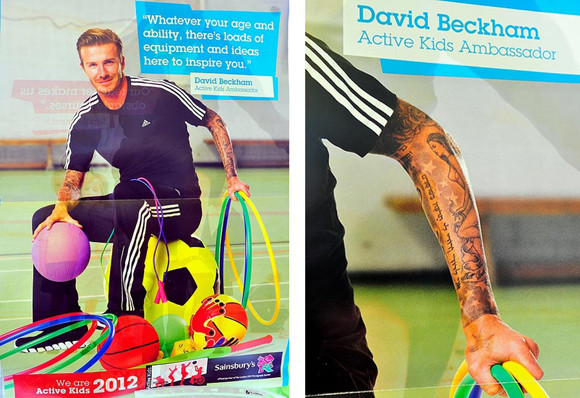 Mới đây, cựu cầu thủ của Man Utd đã nhận lời trở thành gương mặt quảng cáo cho một loại sản phẩm kích thích tính sáng tạo của trẻ nhỏ của hãng Sainsbury. Mọi chuyện sẽ chẳng có gì để nói nếu như Beckham không vô tình để lộ hình xăm Victoria diện đồ lót với dáng vẻ đầy khiêu khích ở cánh tay trái.