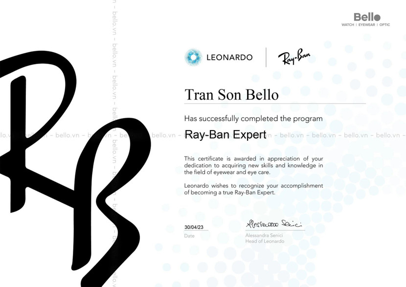 Dịch vụ tư vấn bán hàng được nâng tầm ở mức chuyên gia với những chứng nhận chuyên gia Ray-Ban – Ray-Ban Expert. Người đi đầu là anh Sơn Trần Bello cái tên quen thuộc, lâu năm trên kênh Youtube Bello Eyewear – Kính Hàng hiệu chính hãng.