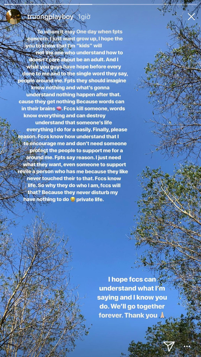 Sự việc có lẽ sẽ tạm khép lại ở đó nếu như Xuân Trường không lên trang Instargram của anh viết một “bức tâm thư” dài dằng dặc bằng tiếng Anh để bày tỏ suy nghĩ của mình về vụ lùm xùm giữa fans và bạn gái. Trong đó, Xuân Trường tự chia fans ra làm hai loại là “fans phong trào”(FPTS) và “fans chân chính” (FCCS), đồng thời anh nhận định "fans phong trào chẳng biết và chẳng hiểu gì cả bởi họ không có não" (!?).