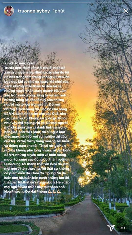 “Tôi sẽ nỗ lực hơn nữa để không phụ lòng những ai yêu bóng đá, những ai yêu mến và luôn mong muốn tôi cùng các đồng đội thành công. Cuối cùng, tôi thành thật xin lỗi vì đã làm mọi người tổn thương.Tôi thật sự không cố ý làm điều đó. Cảm ơn mọi người đã luôn ủng hộ, luôn bên cạnh những lúc tôi thất bại, tôi thật sự rất cảm kích. Hẹn gặp mọi người vào thứ 7 này tại thành phố Hoa Phượng Đỏ Hải Phòng" – Xuân Trường trải lòng.