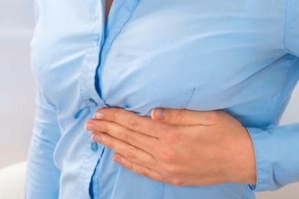 Người bệnh nhận thấy khó chịu ở vùng ức bao gồm: đau, nóng ran ở giữa ngực, đầy trướng bụng, ợ hơi, buồn nôn, muốn đi cầu. Các triệu chứng thường xuất hiện sau các bữa ăn quá no hay có nhiều chất béo, chất đạm và tăng nặng hơn nếu nằm hoặc vận động ngay sau khi ăn.