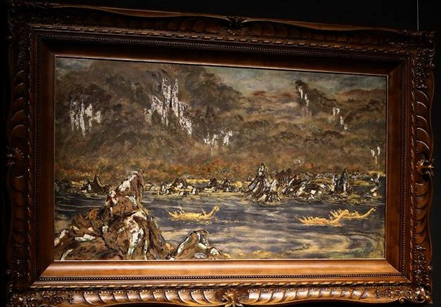 Bức tranh được đánh giá là càng nhìn càng khiến người xem “nổi da gà” bởi độ sâu thẳm của màu và lớp. Những nét tả sóng nước sủi bọt được dát vàng và cách điệu tinh tế như nét vẽ họa tiết trang trí. Không gian đa chiều ảo diệu được tạo ra trên mặt sóng nước nhờ vào các nét thưa mau đan xen.