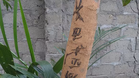 Theo quan sát của phóng viên hàng chữ trên thân cây nhãn kéo dọc theo thân cây, với 6 ký tự, nằm cách mặt đất hơn 1 mét. Các chữ này có màu đen như một thứ mực được xăm lên vỏ cây, mặt chữ được đùn cao hơn so với vỏ thân cây nhãn, dùng tay không thể xóa được. Điều kỳ lạ là khu vực cây nhãn được trồng đất màu mỡ, không đọng nước, thân cây không bị va đập tác động từ bên ngoài, trong khi đó các cây cối xung quanh đều xanh tốt.