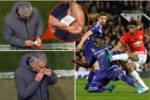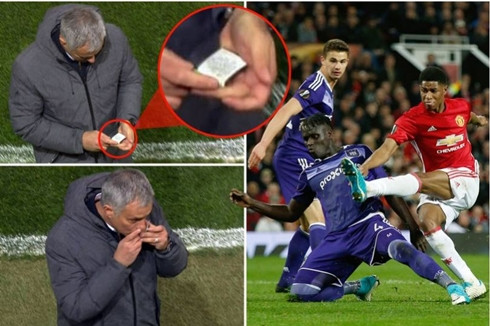 Trong lúc trận đấu ở Old Trafford đến hồi gay cấn vì M.U bất lực trước khung thành của Anderlecht, người ta thấy lạ với hành động úp úp, mở mở của Mourinho. Ống kính thu hình ngay lập tức chĩa về phía chiến lược gia người Bồ Đào Nha.