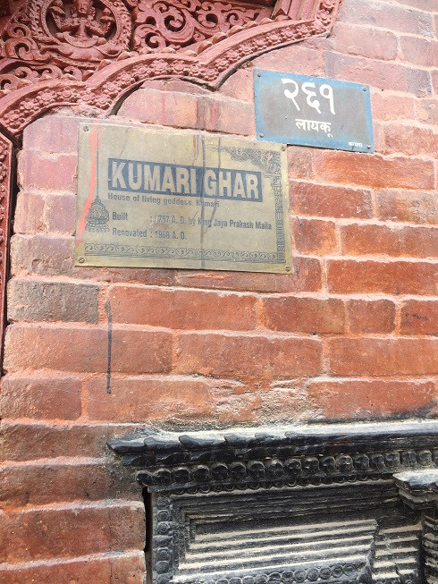 Tấm biển gắn trước cửa Kumari Ghar báo hiệu đây là nơi ở của nữ thần Trinh nữ của Kathmandu