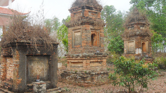 Những di tích còn lại của ngôi chùa cổ thì ba tòa tháp cổ là còn nguyên vẹn nhất, theo ước tính của các cụ tuổi thọ khoảng vài trăm năm. Kiến trúc ba tòa tháp gần giống như kiến trúc tháp Chàm của người Chămpa. Có hai tòa sát nhau cao khoảng hơn 5m, còn một tòa thấp khoảng 3m, theo ghi chép để lại thì đây là ba ngôi mộ để tro cốt của ba vị sư trụ trì. Tháp được xây bằng gạch nung vuông, rỗng ở bên trong, trước mỗi tòa tháp đều có một ô vuông có thể vào bên trong tháp được. Trước kia những vị sư nào sống hơn một trăm tuổi thì khi mất đều được xây tháp để thờ cúng.