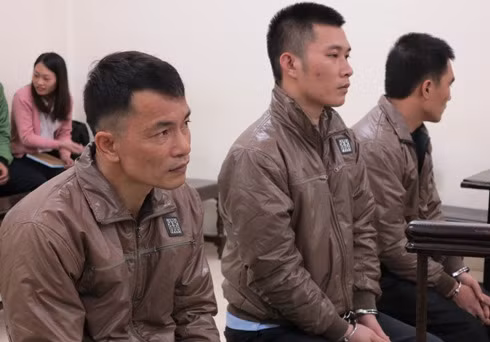 Đàm Quang Cảnh (ngoài cùng, bên trái) cùng đồng phạm tại phiên tòa