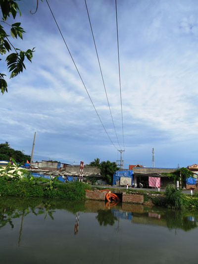Theo ghi nhận của PV, 01 đôi giầy và 01 túi mồi câu cùng chiếc mũ lưỡi trai của anh Phan vứt lại tại hiện trường. Phía trên là đường điện cao thế được kéo bằng dây trần và khoảng cách dây thấp nhất cách mái nhà cấp 4 của gia đình chị Nguyễn Thị Hồng Nhung (48 tuổi), khu 54 hộ dân, thuộc phường Anh Dũng, quận Dương Kinh chưa đầy 2m. Đặc biệt, gần vị trí anh Phan gặp nạn vẫn có 2 cần thủ đang vô tư câu cá.